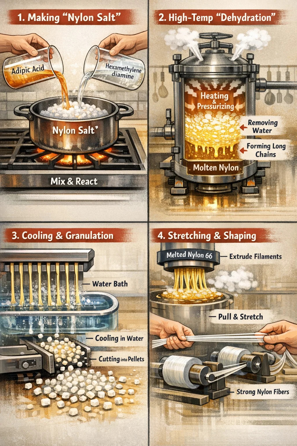 Tu sú zjednodušené kroky na výrobu Nylonu 66: