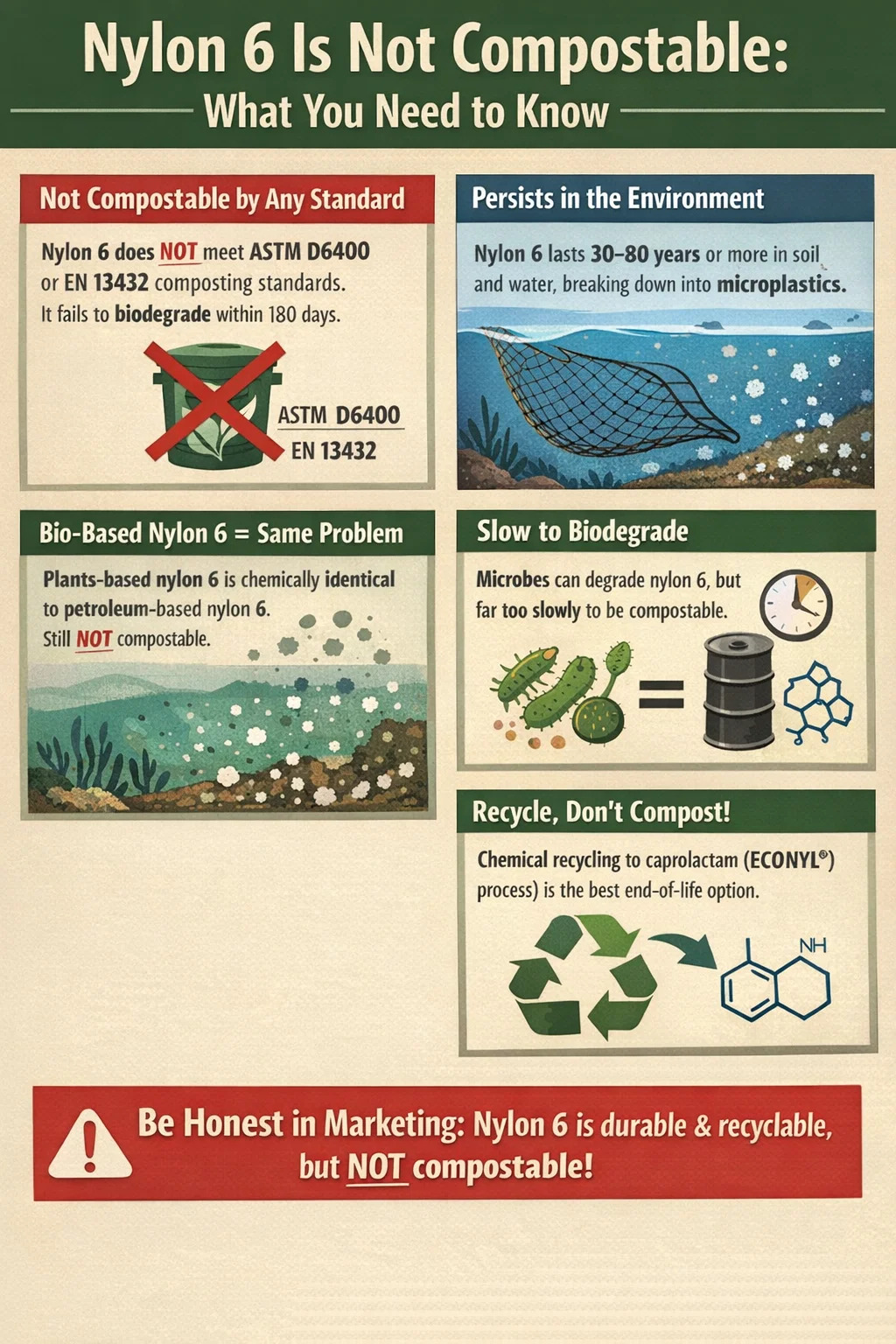 - Nylon 6 nie je kompostovateľný podľa noriem domáceho alebo priemyselného kompostovania (ASTM D6400, EN 13432). Nespĺňa požiadavky na rýchlosť biodegradácie alebo dezintegrácie.