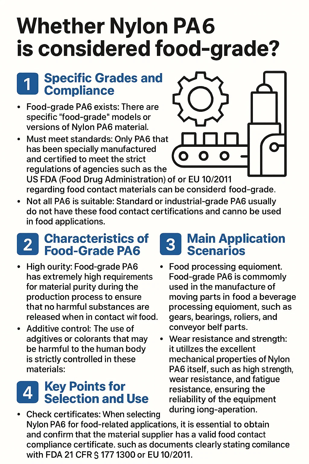 Rozlišujte medzi modelmi: Je dôležité rozlišovať medzi priemyselným PA6 a potravinárskym PA6, pretože existujú zásadné rozdiely v ich použití.