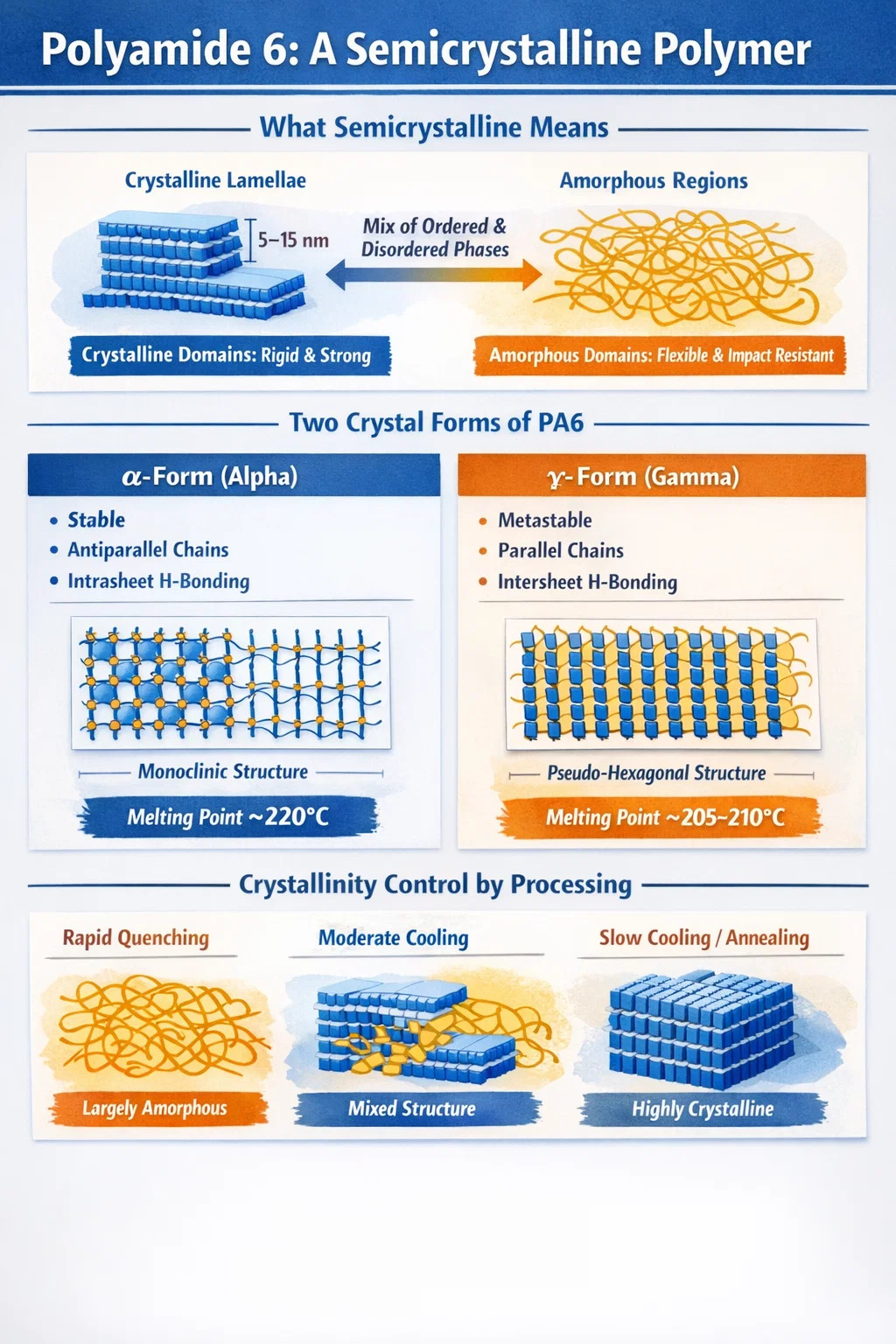 Hnacou silou kryštalizácie v PA6 je tvorba medzimolekulových vodíkových väzieb medzi amidovými (–CO–NH–) skupinami pozdĺž susedných polymérnych reťazcov. Tieto väzby, silnejšie ako van der Waalsove interakcie, ale slabšie ako kovalentné väzby, uzatvárajú reťazce do paralelných usporiadaní a vytvárajú energetickú výhodu, vďaka ktorej je kryštalizácia termodynamicky priaznivá. Dlhé, zapletené reťaze sa však počas tuhnutia nedokážu úplne preorganizovať. Významná frakcia vždy zostáva zachytená v neusporiadaných konfiguráciách a tvorí amorfnú fázu.