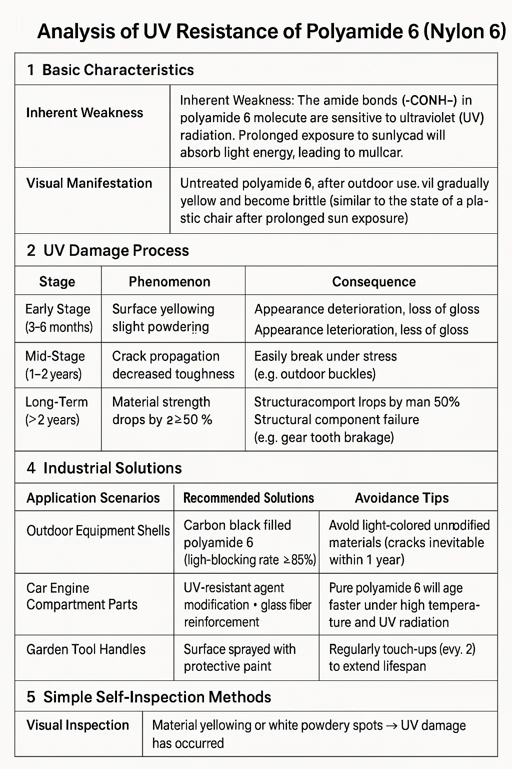 Inherentná slabosť: Amidové väzby (-CONH-) v molekule polyamidu 6 sú citlivé na ultrafialové (UV) žiarenie. Dlhodobé vystavenie slnečnému žiareniu absorbuje svetelnú energiu, čo vedie k pretrhnutiu molekulárneho reťazca.
