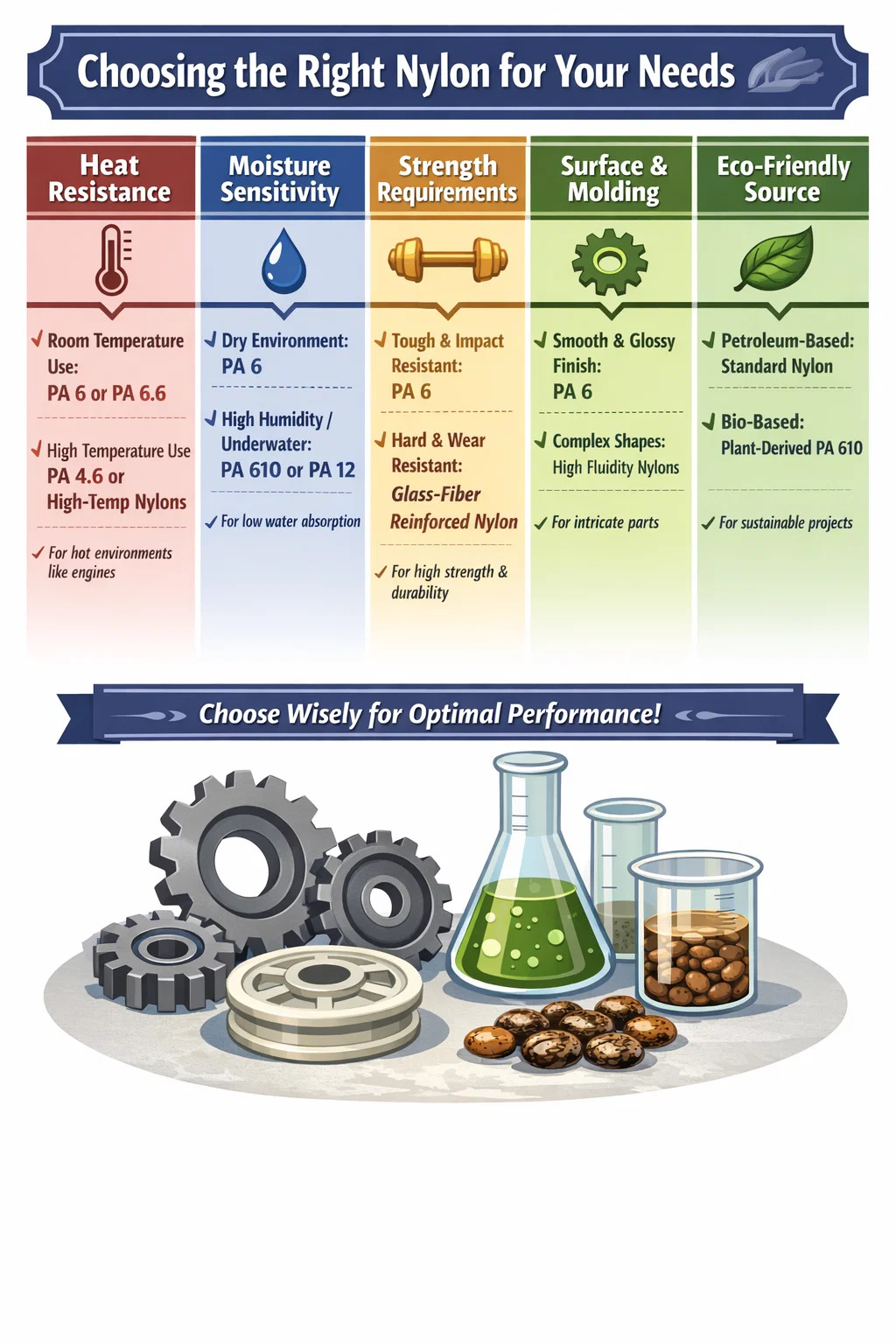 Zelený zdroj: Existuje tiež veľa nylonov extrahovaných z rastlín (napríklad ricínový olej), ktoré sú známe ako nylony na biologickej báze (napríklad niektoré zložky PA 610). Ak váš projekt kladie dôraz na zelenú a ochranu životného prostredia, tento typ polyamidového zdroja bude atraktívnejší.