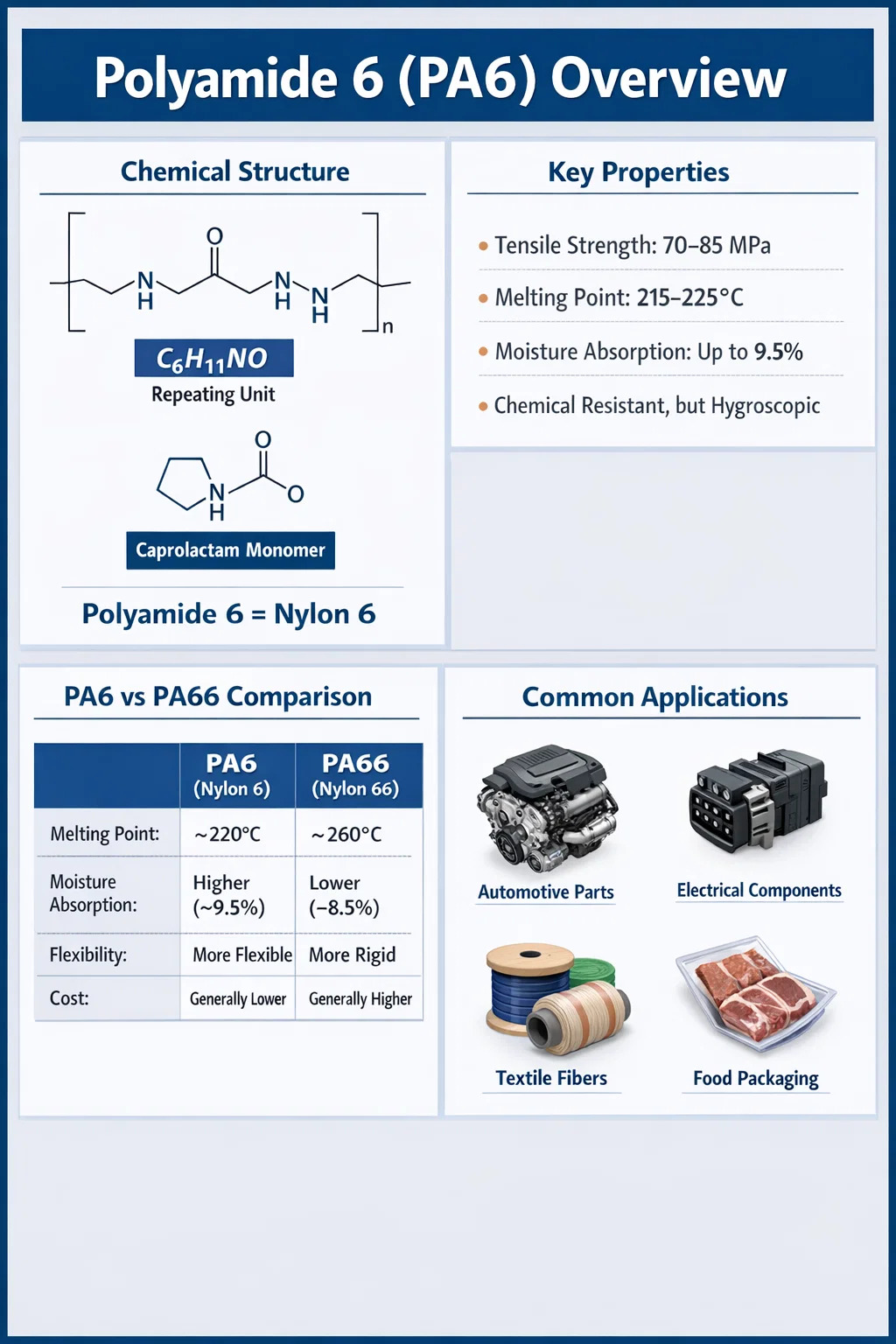 Polyamid 6 je celosvetovo jedným z najpoužívanejších technických termoplastov. Ročný objem výroby presahuje 4 milióny metrických ton a tento materiál je neoddeliteľnou súčasťou priemyselných odvetví od automobilového priemyslu a elektroniky až po textilné a potravinárske obaly. Pochopenie toho, čo znamená PA6, je len východiskovým bodom – jeho chémia, výkonnostné charakteristiky a správanie pri spracovaní definujú, prečo sa stal tak komerčne dominantným.