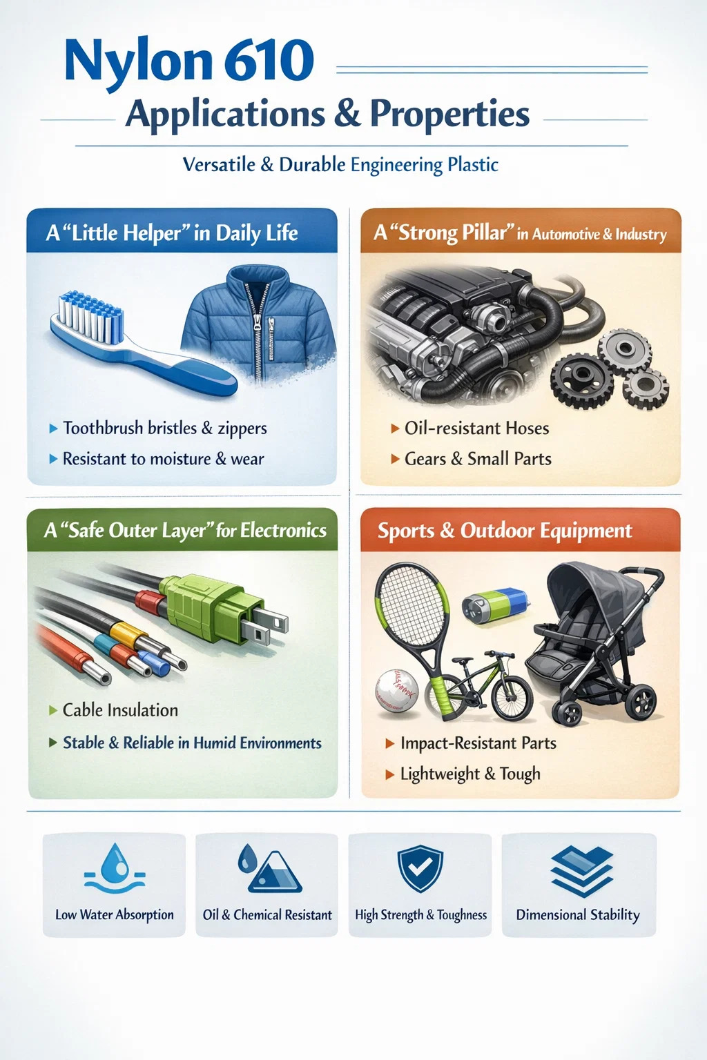 Kefy a vlákna: Štetiny vašej zubnej kefky a zipsy na oblečení sú často vyrobené z Nylonu 610. V porovnaní s bežnými Nylon 6 , funguje lepšie vo vlhkom prostredí, je menej náchylný na absorpciu vody a deformáciu a štetiny si zachovávajú svoju elasticitu aj po dlhšom používaní, čím bránia ich zmäkčeniu a ochabnutiu.